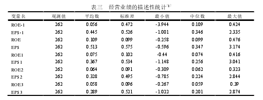 表三是對定向增發(fā)前一年至定向增發(fā)后三年公司的凈資產(chǎn)收益率和每股收益所作的描述性統(tǒng)計,“ROE-1、ROE、ROE1、ROE2、ROE2、ROE3”分別代表定向增發(fā)前一年、當(dāng)年、后一年、后兩年、后三年的凈資產(chǎn)收益率;“EPS-1、EPS、EPS1、EPS2、EPS3” 分別代表定向增發(fā)前一年、當(dāng)年、后一年、后兩年、后三年的每股收益。由表可觀測出,代表公司經(jīng)營業(yè)績的凈資產(chǎn)收益率及每股收益都在定向增發(fā)當(dāng)年達到最大值。在定向增發(fā)當(dāng)年公司的凈資產(chǎn)收益率均值達到 0.109,而每股收益達到 0.513。對于凈資產(chǎn)收益率這個變量來說,定向增發(fā)前其均值為 0.056,在定向增發(fā)當(dāng)年其均值達到最大后,隨后三年雖然均值較定向增發(fā)當(dāng)年有下降,但是不管是定向增發(fā)后第一年、第二年還是第三年,其均值均大于定向增發(fā)前一年的值。但是對于每股收益來說,其描述性統(tǒng)計的值恰恰相反。在定向增發(fā)前,平均每股收益為 0.445,在定向增發(fā)當(dāng)年達到 0.513的極大值后,公司的每股收益不斷下降,并且定向增發(fā)后三年的每股收益均是低于定向增發(fā)前的每股收益。