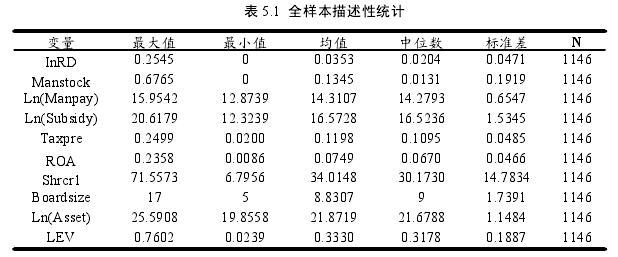 本節(jié)使用 Stata13.0 統(tǒng)計(jì)分析軟件對(duì)研究樣本進(jìn)行描述性統(tǒng)計(jì)分析,表 5.1 列示了主要變量的描述性統(tǒng)計(jì)分析結(jié)果。從表中可以看出,研發(fā)投資強(qiáng)度(In RD)均值和中位數(shù)分別為 3.53%、2.04%,說(shuō)明樣本公司研發(fā)投資水平普遍偏低,不同公司對(duì)研發(fā)投資的重視程度有很大差異。按照國(guó)際評(píng)價(jià)標(biāo)準(zhǔn),公司研發(fā)投資占營(yíng)業(yè)收入之比在 1%至 2%時(shí)可能有所作為,達(dá)到 10%時(shí)創(chuàng)新能力才能較好地發(fā)展,所以我國(guó)公司研發(fā)投資普遍不足,有待于進(jìn)一步提高。高管年薪的自然對(duì)數(shù)[Ln(Manpay)]最小值、最大值、均值分別為12.8739、15.9542、14.3107,說(shuō)明樣本公司高管年薪水平有一定的差異。高管持股比例(Manstock)最小值為 0,均值和中位數(shù)分別為 13.45%、1.31%,說(shuō)明我國(guó)企業(yè)高管存在持股為零的現(xiàn)象,大多數(shù)公司高管持股水平依然較低,股權(quán)激勵(lì)水平差距較大。政府補(bǔ)貼的自然對(duì)數(shù)[Ln(Subsidy)]最小值、最大值、均值分別為 12.3239、20.6179、14.3107,說(shuō)明政府補(bǔ)貼水平是較高的,企業(yè)獲取政府補(bǔ)貼的程度有一定的差異。優(yōu)惠稅率(Taxpre)最小值為 2%,但最大值達(dá)到 24.99%,均值為 11.98%,說(shuō)明樣本公司普遍享受一定的稅收優(yōu)惠,但享受到的稅收優(yōu)惠力度有很大差異。對(duì)于控制變量:企業(yè)經(jīng)營(yíng)績(jī)效(ROA)最小值和最大值分別為 0.0086、0.2358,樣本公司經(jīng)營(yíng)績(jī)效波動(dòng)較大;第一大股東持股比例(Shrcr1)標(biāo)準(zhǔn)差高達(dá) 14.7834,說(shuō)明樣本公司第一大股東持股情況差異性較高;董事會(huì)規(guī)模(Boardsize)普遍集中在 8 至 9個(gè)人,標(biāo)準(zhǔn)差為 1.7391,樣本略有差異;樣本公司規(guī)模[Ln(Asset)]略有差異,大部分屬于中小規(guī)模;樣本公司財(cái)務(wù)杠桿(LEV)均值為 33%左右,財(cái)務(wù)狀況良好。