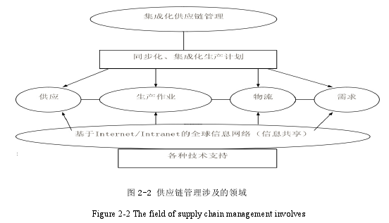 根據交通運輸部對供應鏈的定義:依托以互聯網為代表的信息技術統籌、配置物流、現金流、信息流等資源并采取科學合理的管理方法調配和周轉活動[13]。供應鏈管理要求企業之間進行“強強聯合”,建立長期合作伙伴關系, 將非核心業務委托給專業公司來完成,本身將有限資源運用到核心業務上,通過業務流程改造,持續增強企業綜合競爭力,同時從雙贏角度,還能為供應鏈上其他企業創造更好的競爭環境,實現共同發展。在下圖 2-1 中,我們給出企業供應鏈上不同企業之間的關系圖,從中可以看出,一條完善的供應鏈覆蓋了企業經營的產、供、銷等所有環節。 信息共享是供應鏈管理實際運用中重要基礎條件之一。供應鏈管理需要企業在各個環節的支持,即在不同運作節點進行信息傳播和交流,所以,信息技術對于供應鏈管理是其順利開展的必要條件。隨著以互聯網、計算機為代表的信息技術不斷發展,供應鏈管理獲得了更多技術手段支持, 企業之間信息共享水平得到顯著提升。[14] 供應鏈管理主要涉及四個方面的內容(如下圖 2-2):即物資供應(Supply)、生產安排(Schedule Plan)、物流管理(Logistics)、需求分析(Demand),企業所有生產活動都納入到其中[15]。其中不僅涉及到實物物資在供應鏈環節之間的運動和流通,還包括供應商遴選、物資需求、計劃制定、計劃實施、需求分析、庫存控制、用戶關系維護、售后服務以及現金流管理等。供應鏈體系在被構建的過程中,供應鏈上各種業務單位之間的合作關系也在持續的鞏固和發展;這些選取出的業務伙伴有助于把原來對立的競爭關系轉換成協同合作的伙伴關系[16]。這種建立在合作共贏基礎上的合作關系對供應鏈上企業間的信息共享程度和水平提出了更高的要求,不僅要求這些企業之間實現銷售、庫存、需求、物流等信息的交換和利用,而且還得具有較高的利用效率。