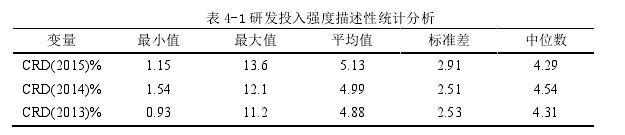 為了對所選 30 家企業(yè) 2013-2015 年研發(fā)投入情況有一個比較清晰直觀的了解,本文考察了其 3 年來平均數(shù)、極值等指標的變化,結(jié)果如下表所示:由上表可知,河南省上市高新技術(shù)企業(yè)的研發(fā)投入強度在逐年穩(wěn)步提高,從2013 年的 4.88%上升到了 2015 年的 5.13%,增幅為 5.07%。增幅雖然不多,但是仍然是一個好的趨勢。我省企業(yè)逐步明白加大研發(fā)投入力度是十分必要的。近三年來企業(yè)研發(fā)投入強度最大值 13.6%,在我省經(jīng)濟相對落后的情況下,這已經(jīng)是一個很大的數(shù)值了。但是最小值只有 0.93%,個體企業(yè)間差距很大,國際上通常認為低于 1%就是比較難以生存了。近三年來我省 30 家企業(yè)研發(fā)投入強度均值都在 5%左右,處在一個中等的水平,與國際上認可的有競爭力的 5%的水平近乎吻合。企業(yè)的 Tobin’s Q 值最低僅為 0.93,最高可以達到 8.472,相差 9 倍,企業(yè)投資回報率有很大的差距。從市場角度來看,有些企業(yè)被投資者看好,有些企業(yè)幾乎被市場遺忘。權(quán)益報酬率最高可以達到 14.35%,是最小值得 37 倍,猶如云泥之別。這說明,30 家企業(yè)利用股東投入資本獲取利潤的能力有較大的差別。資產(chǎn)負債率的平均值為 35.36%,并不是很高,意味著河南省上市高新技術(shù)企業(yè)整體負債水平適中,企業(yè)可以較好的發(fā)展下去。從企業(yè)性質(zhì)的均值為 0.233 可以看出,說明河南省上市高新技術(shù)企業(yè)中以民營企業(yè)為主,國有控股企業(yè)較少。從另一點也說明了政府想要提高當?shù)氐目蒲兴剑龠M經(jīng)濟發(fā)展,應(yīng)該根據(jù)實際情況,加大力度扶持民營高新技術(shù)企業(yè)。