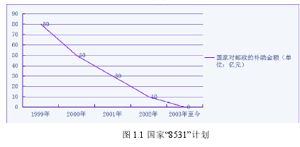 在 1998 年郵政拆分以前,中國郵政的傳統(tǒng)經(jīng)營項目主要是一些勞動密集型的函件、報刊發(fā)行等業(yè)務(wù)。這種業(yè)務(wù)的特點是業(yè)務(wù)收入較低。主營業(yè)務(wù)收入低的同時,郵政同時還在承擔(dān)著國家普遍服務(wù)的功能。巨大的壓力下,我國郵政一直處于嚴(yán)重的虧損狀態(tài),上個世紀(jì)末,中國郵政總公司虧損總額上百億。針對郵政的現(xiàn)實困難國家特別推出了一個扶持郵政的計劃,即“8531”計劃。這個計劃是:在 1999 年國家補貼郵政 80 億元,2000 年國家補助郵政 50 億元,2001年國家補助郵政 30 億元,2002 年國家補助郵政 10 億元,從 2003 年起,國家對郵政不再進(jìn)行補助,中國郵政進(jìn)入自主盈虧的階段。如圖 1.1 所示。