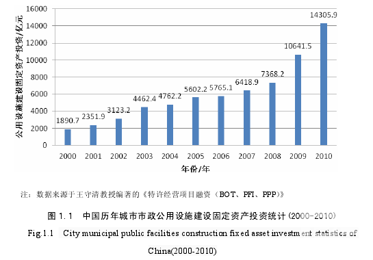 ?統計資料表明,2000 年至 2010 年以來,我國城市市政公用基礎設施投資額逐年增加,固定資產投資在 2010 年達到 14305.9 億元,近幾年上升速度有加大的趨勢(如圖?1.1 所示)。