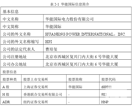 公司成立于 1994 年 6 月 30 日,采取國內外合資形式,主要經濟活動是投資開發和經營大規模發電廠。公司擁有大量現代化設備,生產技術先進,于 1994 年 10月,以 3,125 萬股美國存托股份(“ADS”)在美國紐約證券交易所上市(代碼:HNP)。2001 年 11 月,公司以 3.5 億股 A 股(代碼:600011)成功在上海證券交易所上市,其中包含 2.5 億股社會公眾股。目前,公司在境內和境外發行的總股本約有 140.6 億股。整理信息見表 2-1。