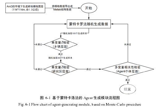Agent 生成模塊主要由兩步串聯(lián)的步驟構(gòu)成:第一,利用蒙特卡洛發(fā)隨機生成所有 Agent各個因素(變量)的具體值(具體方法見 5.3.1部分),數(shù)據(jù)生成的關(guān)鍵統(tǒng)計量(如均值、方差等)根據(jù)村層面的調(diào)查樣本參數(shù)進行設(shè)定。第二,對生成的變量值做多尺度統(tǒng)計檢驗。統(tǒng)計檢驗具體包括單變量參數(shù)檢驗與多變量相關(guān)性檢驗兩方面內(nèi)容,參考 Berger and Schreinemachers(2006)的檢驗準則,單變量參數(shù)檢驗將在總體層次(即整個研究區(qū)域)與聚類層次(即鄉(xiāng)鎮(zhèn)層)開展,而多變量相關(guān)性檢驗將在 Agent 個體層次開展。隨機數(shù)的生成需要通過所有檢驗,否則 Agent 生成模塊將重新運轉(zhuǎn),直至生成的所有變量值符合標準為止(圖 6-1)。