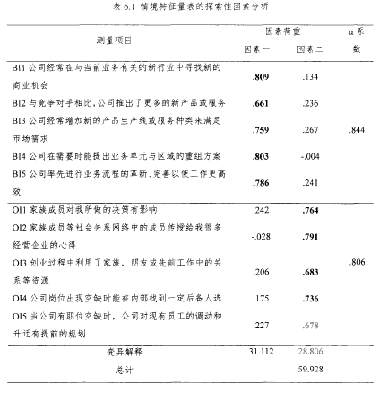 情景特征量表包括了 10個題項,a系數為0.846,高于0.7,說明了問卷的信度可以接受。對情境特征量表進行效度檢驗后,本量表的KMO值等于0.874,也高于研究中一般可以接受的0.7標準,可以認為該量表能夠進行因素分析。此外Bartlett球體檢驗的結果為Sig=0.000。此外,為了對本量表的結構進行進一步的分析和討論,通過主成分分析來做探索性因素分析,并使用方差最大化旋轉變換,情境特征量表詳細結果如表6.1所示: