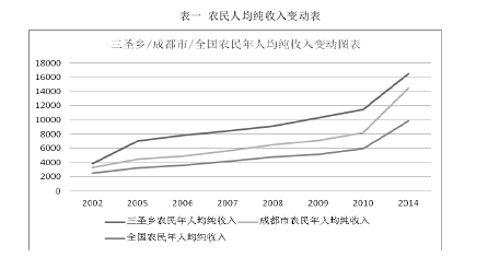 三圣鄉(xiāng)人多地少,根據(jù) 2004 年的統(tǒng)計(jì),人均耕地面積僅為 0.7 畝,土質(zhì)屬于典型的龍泉山脈酸性膨脹土,不太適合傳統(tǒng)農(nóng)業(yè)的發(fā)展,曾是成都市錦江區(qū)經(jīng)濟(jì)條件最落后的鄉(xiāng)之一。生產(chǎn)方式單一,農(nóng)民收入絕大多數(shù)來源于水稻、小麥等傳統(tǒng)的糧食作物。2000年,三圣鄉(xiāng)的人均年收入不到 1000 元,且 25%以上屬于貧苦戶。2003 年,四川省首屆花卉博覽會(huì)在成都市錦江區(qū)三圣鄉(xiāng)紅砂村舉辦,三圣鄉(xiāng)的發(fā)展以此為轉(zhuǎn)折點(diǎn)從此步入了新的時(shí)期。這次博覽會(huì)吸引了超過 100 萬的游客,給了三圣鄉(xiāng)農(nóng)民很大的觸動(dòng),使他們意識到小規(guī)模的農(nóng)家樂經(jīng)營方式已經(jīng)無法滿足不同層次的消費(fèi)的需求,農(nóng)家樂必須轉(zhuǎn)向規(guī)模化、集約化經(jīng)營的發(fā)展模式。于是,在區(qū)鄉(xiāng)兩級政府的積極引導(dǎo)下,村集體將農(nóng)民手頭上零散的土地和種植于地上的樹、花卉等集中起來,籌建企業(yè)對整理后的資源進(jìn)行規(guī)模化經(jīng)營,最終形成了“公司+農(nóng)民”的經(jīng)營模式。在紅砂村打造了“花鄉(xiāng)農(nóng)居”并取得后,三圣鄉(xiāng)又緊鑼密鼓地打造了“江家菜園”江家堰村、“幸福梅林”幸福村、“東籬菊田”駙馬村和“荷塘月色”萬富村,與“花鄉(xiāng)農(nóng)居”紅砂村合稱為“五朵金花”。2010 年,三圣鄉(xiāng)接待游客 973.97 萬人,旅游收入為 28486.4 萬;2011 年接待游客1179.18 萬人次,旅游收入為 44967.55 萬元。農(nóng)民的人均純收入上,實(shí)行土地改革前的2002 年僅為 3850 元,改革推行后兩年后的 2005 年即為 7060 元,幾乎翻了一番;2006年為 7850 元,2007 年為 8480 元,2008 年為 9120 元,2009 年為達(dá) 10280 元;2010 年農(nóng)民人均純收入達(dá) 11450 元。而在 2014 年,三圣鄉(xiāng)的農(nóng)民人均收入已經(jīng)超過了 1.6 萬元,超過了我國和成都市平均農(nóng)民收入水平(如,表一所示)。