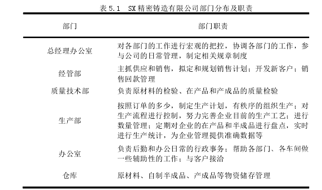 SX 精密鑄造有限公司建立于 1993 年,距離高速路口較近,交通便利,在該縣具有優(yōu)越的地理位置。公司配有 0.15T、0.5T、1T 中頻電爐,以及其他設(shè)備儀器 300 余套。蠟?zāi)hT件重量0.1~200Kg現(xiàn)有2000T生產(chǎn)能力,消失模鑄件重量50~2000Kg現(xiàn)有5000T生產(chǎn)能力,樹脂砂鑄造現(xiàn)有 1000T 生產(chǎn)能力?,F(xiàn)生產(chǎn)鑄件材質(zhì)為碳鋼、合金鋼、不銹鋼、蠕墨及球墨鑄鐵等。產(chǎn)品主要應(yīng)用于鋼件鑄造及機(jī)械加工、鐵藝制作,礦山機(jī)械設(shè)備及生物質(zhì)壓縮成型設(shè)備的制造。根據(jù)客戶不同需要,材質(zhì)分別符合 GB、ISO、BIN、NF、BS、JIS、ASTM 等認(rèn)證。自 1993 年創(chuàng)辦以來,至今已有二十三年的鑄造工作經(jīng)驗(yàn),技術(shù)力量雄厚,優(yōu)秀的企業(yè)文化,造就了良好的員工素質(zhì)。公司在發(fā)展的路上,與石家莊某大學(xué)合作,成為該學(xué)校材料學(xué)院的試驗(yàn)基地。 企業(yè)上設(shè)總經(jīng)理辦公室負(fù)責(zé)整個企業(yè)的運(yùn)作,下設(shè)經(jīng)管部、質(zhì)量技術(shù)部、生產(chǎn)部、辦公室、倉庫負(fù)責(zé)日常活動及生產(chǎn)事宜。公司的各部門及其職能詳情請見表 5.1:SX 公司規(guī)模較小,部門設(shè)置簡單,成本控制也相對簡單。SX 公司進(jìn)行成本控制的主要手段有降低廢品率、提高資源的利用率、增加產(chǎn)量、減少其他費(fèi)用支出等。該公司目前對成本核算的重視程度較低,采用傳統(tǒng)成本核算進(jìn)行簡單的成本統(tǒng)計(jì)與計(jì)算,形式相對粗放。根據(jù)公司相關(guān)記錄,整理歸納出 SX 公司的主要成本耗費(fèi)有以下幾個方面:原材料采購成本、輔助材料成本、水電費(fèi)、工資及福利費(fèi)用、固定資產(chǎn)折舊費(fèi)、制造費(fèi)用等。SX 將原材料按照使用量與生產(chǎn)損耗的合計(jì),計(jì)入直接材料科目;依據(jù)人工工資和福利費(fèi)的發(fā)生額,統(tǒng)計(jì)出完工產(chǎn)品的全部人工成本,選用合理的分配方式,計(jì)入各完工產(chǎn)品的直接人工科目;對于制造費(fèi)用基本按照人工工時予以分?jǐn)?。這樣的核算方法會造成高產(chǎn)量高分?jǐn)?,低產(chǎn)量低分?jǐn)偟默F(xiàn)象,存在著一定的不科學(xué)性,容易為企業(yè)提供缺乏準(zhǔn)確性的產(chǎn)品成本信息。