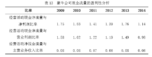 因為盈利模式的最終目標就是使企業獲得利潤,所以評價一個公司盈利模式的優劣,就應比較所研究公司與同行業其他公司的盈利模式的盈利性。本文依據 Afuah 和 Tucci(2001)對企業盈利狀況的評價方法,主要從收入和現金流兩個方面對蒙牛公司的盈利模式進行財務評價。如果企業的現金流、收入比同行業的其他企業好,則表明該企業具有適合自己的盈利模式,存在一定的競爭優勢, 僅用盈利性來對企業的盈利模式進行評價存在一定局限,此種評價方法更多是一種 “過去時”,是對盈利模式實施以后的效果進行衡量,而不能用于事前預測、評估。所以評價過程就存在以下問題:首先是很多公司的盈利模式都是在不斷地發展變化的,對于新公司,依據設定的盈利模式將會在未來幾年或十幾年內獲利,目前可能獲利極少,甚至虧損;再者目前盈利情況很好的公司可能有較差的盈利模式,但這種盈利模式對利潤的影響很有可能是尚未充分表現,因此不能片面的依靠短暫的盈利性去評價一個公司或企業盈利模式的優劣。 本章應用杜邦分析方法,充分解析了蒙牛公司的盈利狀況,進而再從現金流情況分析企業的盈利質量、籌資以及支付能力。本章將著重分析蒙牛公司 2009-2014 年年報的財務數據,力爭通過對近幾年的財務數據進行財務分析,可以深入了解蒙牛公司 2009-2014 年盈利模式的運行情況并對其作出合理評析。