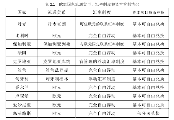 歐盟的歷史最早可追溯到 1951 年,這一年荷蘭、盧森堡、比利時建立了三國經濟聯盟,1952 年法國、聯邦德國、意大利、荷蘭、比利時和盧森堡 6 國建立了歐洲煤鋼共同體,1958 年這 6 國共同建立了歐洲經濟共同體和歐洲原子能共同體,1965年上述 6 國決定將三個共同體合并統稱“歐洲共同體”即“歐共體”。至 1993 年歐共體正式易名為歐盟。目前歐盟共有 28 個成員國,分別為丹麥、比利時、保加利亞、法國、克羅地亞、波蘭、匈牙利、愛爾蘭、盧森堡、愛沙尼亞、塞浦路斯、瑞典、奧地利、立陶宛、希臘、羅馬尼亞、德國、芬蘭、意大利、英國、拉脫維亞、荷蘭、捷克、葡萄牙、斯洛伐克、西班牙、斯洛文尼亞和馬其他。截至 2014 年,GDP 總量達18 萬億美元,人口達 5 億,各國流通貨幣、匯率制度和資本項目管制情況如表 2.1所示,可以看出歐盟大部分國家匯率制度為完全自由浮動,資本項目貨幣基本可自由兌換。