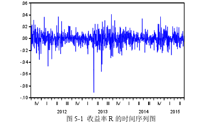 本文采用的數據是倫敦黃金現貨每日收盤價格。數據區間為紫金礦業收購左岸金礦項目后的時期至今,即紫金礦業持有該項目的時間 2011/09/29 日到 2016/05/02 日,扣除非營業日,共有 1165 個數據。其中選取 2011/09/29-2015/06/30 日共 977 個數據,用于構建 GARCH-Va R 模型和確定模型的估計參數,剩余 2015/06/30-2016/05/02 日的共 219 個數據,用于檢驗構建的 GARCH-Va R 模型的有效性。數據來源是大智慧軟件。采用 Eviews8.0 軟件對數據進行處理。采用 Eviews 軟件計算得出黃金現貨收益率序列如下圖。從圖中可以看出 LME 黃金現貨收益率序列 R 的波動總體較為平穩,但是也可以經常觀測到異常值的出現且次數較為頻繁,可以認為該序列存在集聚性和爆發性,屬于隨機序列。對黃金現貨收益率序列進行進一步處理,對數據的統計特征進行進一步觀察。得到收益率的柱形統計圖。從圖中可以看出黃金現貨的對數收益率序列的均值(mean)是-0.000327,標準差(Std.Dev.)是 0.010671。同時從收益率序列的偏度(Skewness)-0.904481,看出收益率序列有長的左拖尾。而峰度(Kurtosis)10.48776,大于 3,表明分布突起程度大于正態分布,說明該收益率序列的分布具有 “尖峰后尾”特征。J-B 統計檢驗得出該收益率序列拒絕服從正態分布的假設。