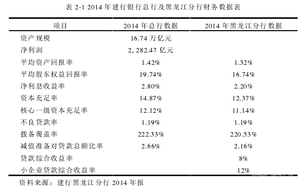 建設銀行黑龍江省分行是中國建設銀行所屬的一級分行。近年來,黑龍江分行發展迅速,截至到 2014 年底,共有市地分行 12 家,城區支行 96 家、縣級支行 56 家,分理處 224 家、儲蓄所 54 家。主要業務有存款、貸款、代收代付等,近幾年,增加了中小企業貸款項目,總體上看,黑龍江分行發展良好,2014 年建設銀行黑龍江省分行貸款綜合收益率達到 8%,居全國首位,其中中小企業貸款綜合收益率達到 12%,具體數據見表 2-1。建行在機構上設置了三級管理機制,即總行、分行、支行。總行、省級分行、市級(自治區)分行設立管理部門,為管轄行;其余為經辦行,主要進行銀行業務處理。建行黑龍江分行在機構設置上按照建行總行的規定進行設置,分行設置管理部門、市地級分行、縣級分行、營業部。目前黑龍江分行的機構數量如表 2-2 所示。 黑龍江分行的存款主要包括財政性存款(待結算財政款項、財政性活期存款、地方財政庫款、財政預算專項存款和財政預算外存款)、全口徑存款(企業存款與個人存款、同業存款)。