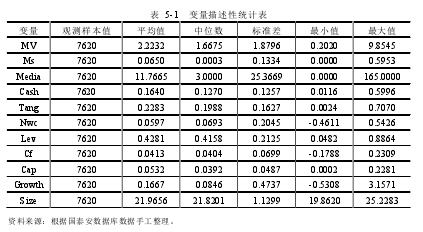 表5-1描述了各樣本變量的統計量。從樣本描述性統計中可以看出公司市場價值(MV)的平均值為2.2232,中位數為1.6675,說明很多公司的市場價值(MV)都低于平均水平,并且標準差顯示為1.8796,不同公司存在較大差異。衡量公司高管股權激勵程度的高管持股比例(Ms)的平均值和中位數分別為0.065和0.0003,中位數水平遠低于均值,說明2012-2015年大部分上市公司高管股權激勵程度要低于平均值,我國高管持股比例普遍不高,這與葉松勤和徐經長(2013)的研究結果一致,為后文證明股權激勵處于趨同階段提供基礎;而最大值與最小值分別為0.5953和0.0000,說明各上市公司之間高管股權激勵的程度存在較大差異,標準差0.1334也恰好說明了這一點。媒體關注(Media)的均值和中位數分別為11.7665和3.0000,標準差為25.3669,表明不同公司受媒體關注程度存在顯著性差異。公司現金持有量(Cash)的平均值為0.1640,表明我國的滬、深兩市A股上市公司的現金持有水平較高,平均占總資產的16.40%,較高的現金持有一方面能夠維持公司的日常運營,另一方面也會帶來代理問題。 資產有形性(Tang)的平均值和中位數分別為0.2283和0.1988,說明大部分企業固定資產占總資產的比例要低于平均值。而Tang的標準差為0.1627,這表明我國上市公司資產有形性存在較大差異。我國上市公司凈營運資本(Nwc)的平均值為0.0597,中位數為0.0693,標準差為0.2045,這表明不同上市公司的凈營運資本差異較大。從財務杠桿(Lev)來看,其均值為0.4281,中位數為0.4158,說明超過一半的上市公司的資產負債率低于50%。從經營現金流量凈額(Cf)來看,平均值與中位數分別為0.0413和0.0404,標準差為0.0699,各公司的差異相對較小。上市公司資本支出(Cap)均值、中位數和標準差分別為0.0532、0.0392和0.0487,說明資本支出占總資產的比例要低于均值,從標準差來看各公司的差異不是很明顯。在公司成長性(Growth)方面,平均值0.1667遠高于中位數0.0846,這說明在2012—2015年大部分公司的成長性要低于平均值,標準差0.4737則說明了各公司在成長性方面存在的差異顯著。資產規模(Size)用總資產的自然對數衡量,平均值和中位數分別為21.9656和21.8201,標準差為1.1299,各上市公司存在顯著差異。